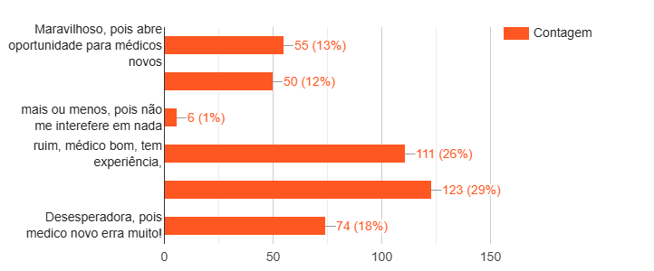 A pesquisa também investigou a opinião dos usuários sobre o descredenciamento de médicos experientes. A maioria dos entrevistados, 29%, considerou a situação “desesperadora, pois médico novo erra muito!”. Outros 26% classificaram o descredenciamento como “ruim, (pois) médico bom tem experiência”. Apenas 13% viram a situação como “maravilhosa, pois abre oportunidade para médicos novos”.