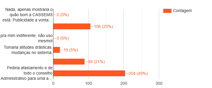 A pesquisa também questionou os usuários sobre o que fariam se fossem o presidente da CASSEMS. Quase metade dos entrevistados, 49%, afirmou que “pediria afastamento de todo o conselho administrativo para uma auditoria”. Outros 25% disseram que fariam “publicidade à vontade” para mostrar o quão bom é a CASSEMS.